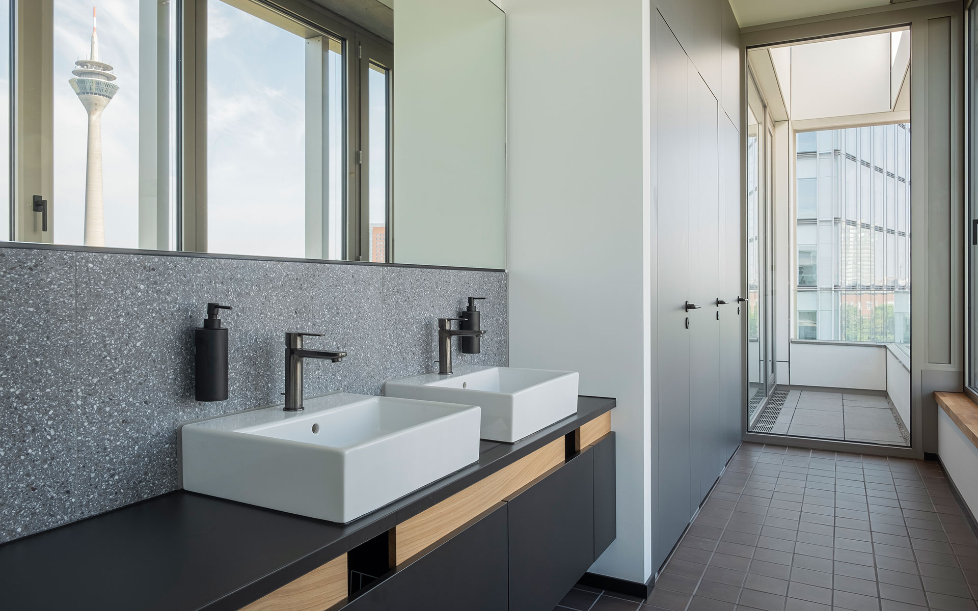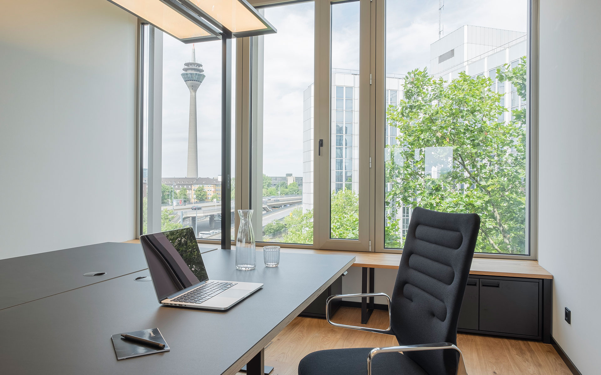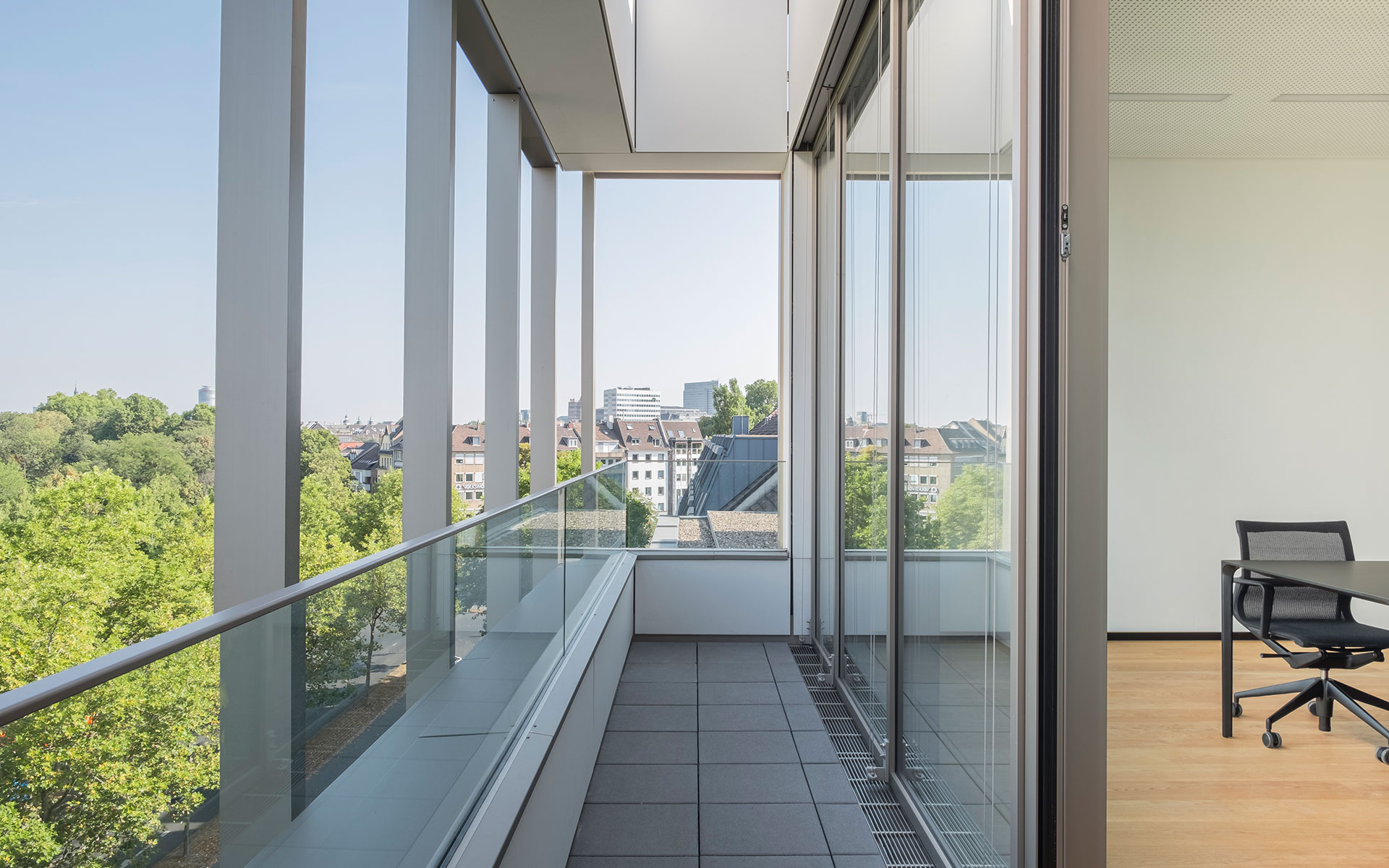 Die Konferenzebene im Staffelgeschoss bietet den Ausblick in alle Richtungen und dazu eine begrünte, großzügige Dachterrasse. Der große Konferenzraum lässt sich variabel in bis zu drei kleinere Konferenzräume aufteilen.